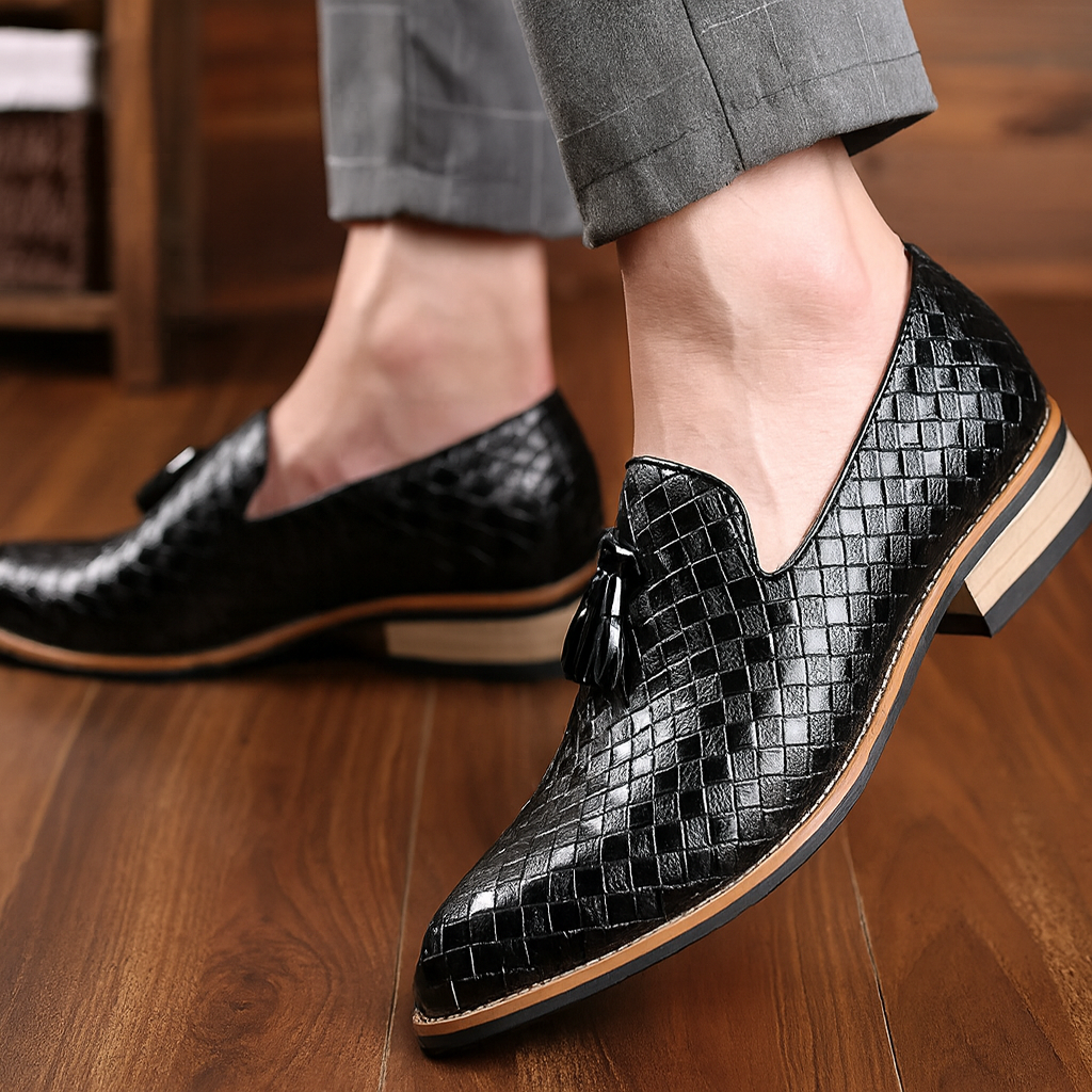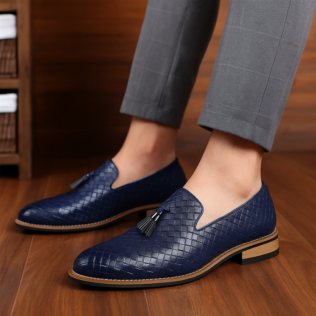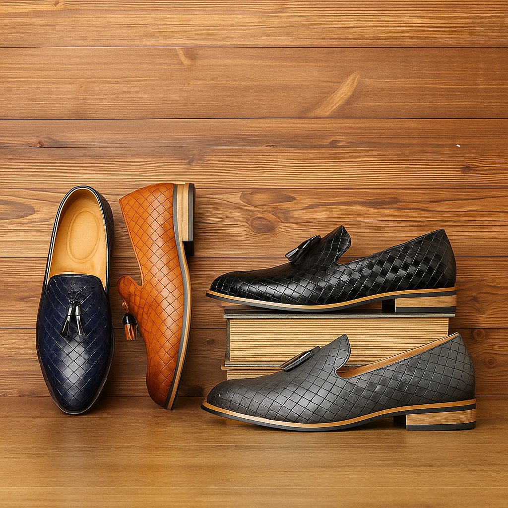 Tailored with attention to detail, these loafers feature a genuine leather upper with a textured patterned finish and hand-stitched tassel accent. The slip-on style offers effortless wear, while the cushioned insole and soft lining provide lasting comfort. A refined pair that blends artisan materials with everyday ease, suited for both tailored and smart-casual looks.