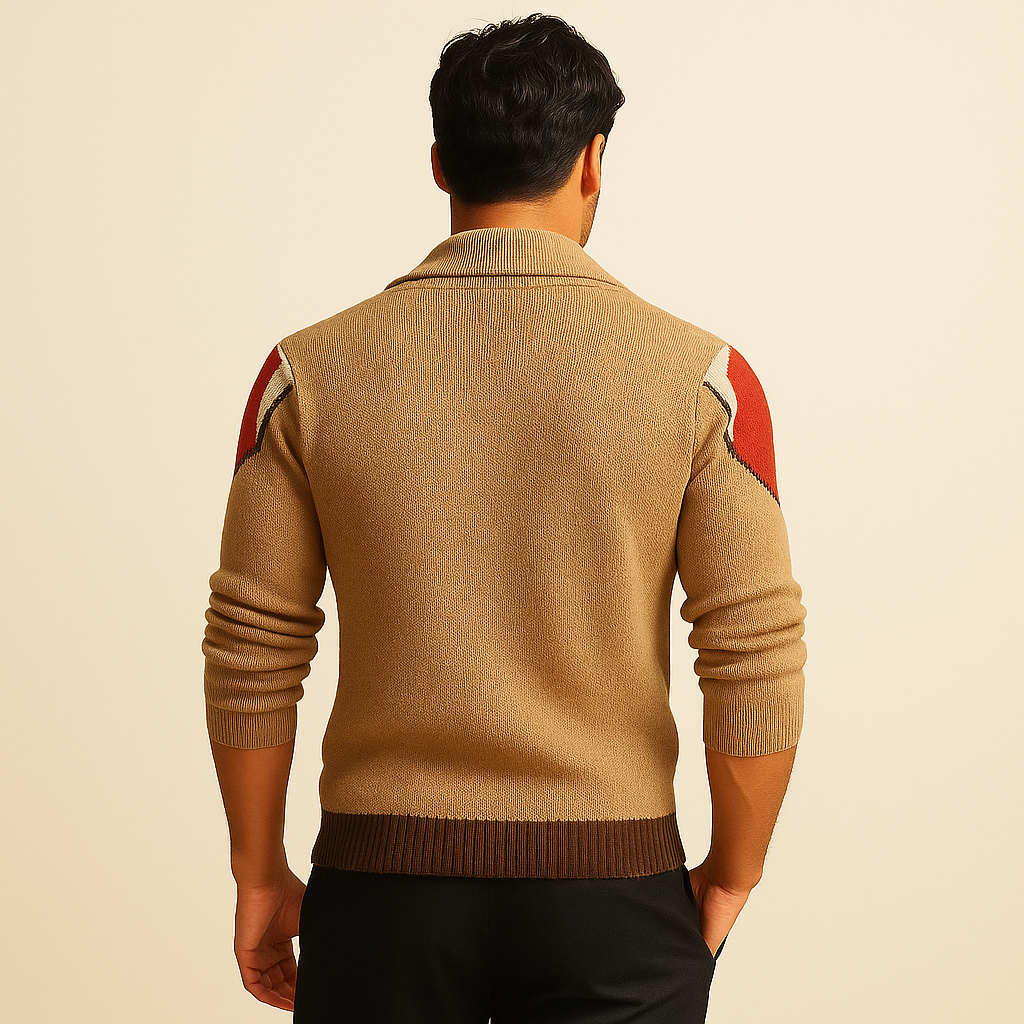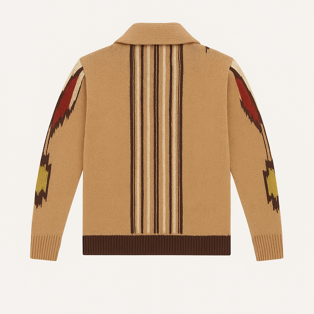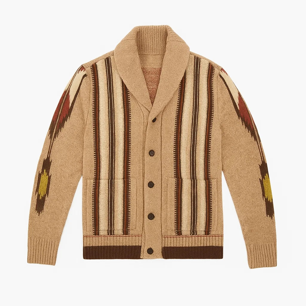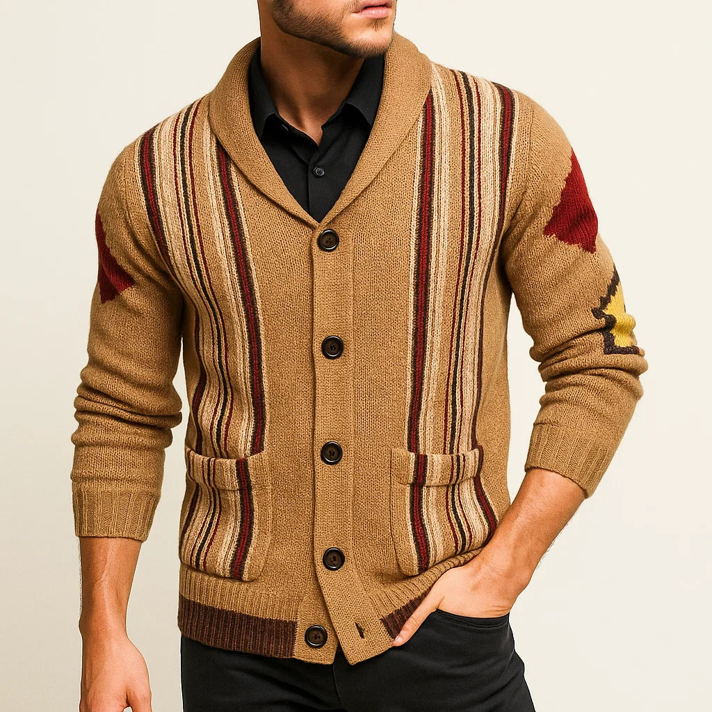 Crafted from a cotton-blend knit with a rich, textured finish, this cardigan blends lasting comfort with a rugged edge. The shawl collar lends a structured silhouette, while the earth-toned stripes channel a distinctly autumn character. Designed as a versatile layer for cooler days, it delivers warmth and style in equal measure.