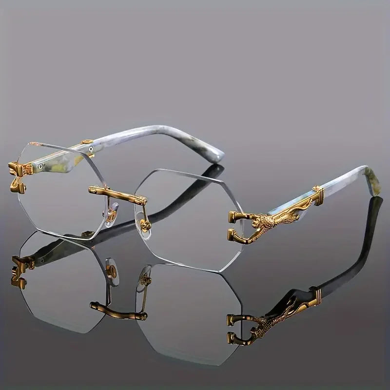 - Rimless design with gold dragon detailing at the hinges